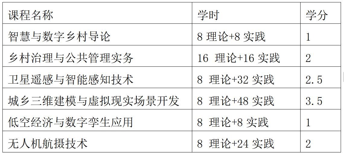 本微专业总学分 12 分,课程体系紧扣 “智慧技术 + 乡村治理” 核心培养方向,设置 6 门核心课程:《智慧与数字乡村导论》搭建领域认知框架,《乡村治理与公共管理实务》夯实基层治理与考公核心素养,《卫星遥感与智能感知技术》《无人机航摄技术》《低空经济与数字孪生应用》《城乡三维建模与虚拟现实场景开发》聚焦空天地一体化技术、低空经济应用等核心技能,形成 “理论奠基 + 技术实操 + 应用落地”的课程闭环,全面支撑学生跨界能力培养。