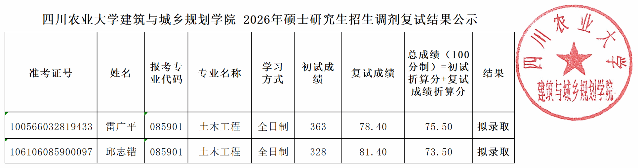 根据研究生院《2026年招收攻读硕士学位研究生复试、调剂、录取工作办法》(校研发【2026】13号)文件要求,本着公平、公开、公正的原则,学院在招生工作领导小组的指导下完成了研究生调剂复试工作。现将拟录取名单公示,公示期为7天(4月14日-4月20日)。如有异议,请在公示期内实名进行意见反馈,联系电话:028-87124710,地点:2C311,监督:028-87298657。
